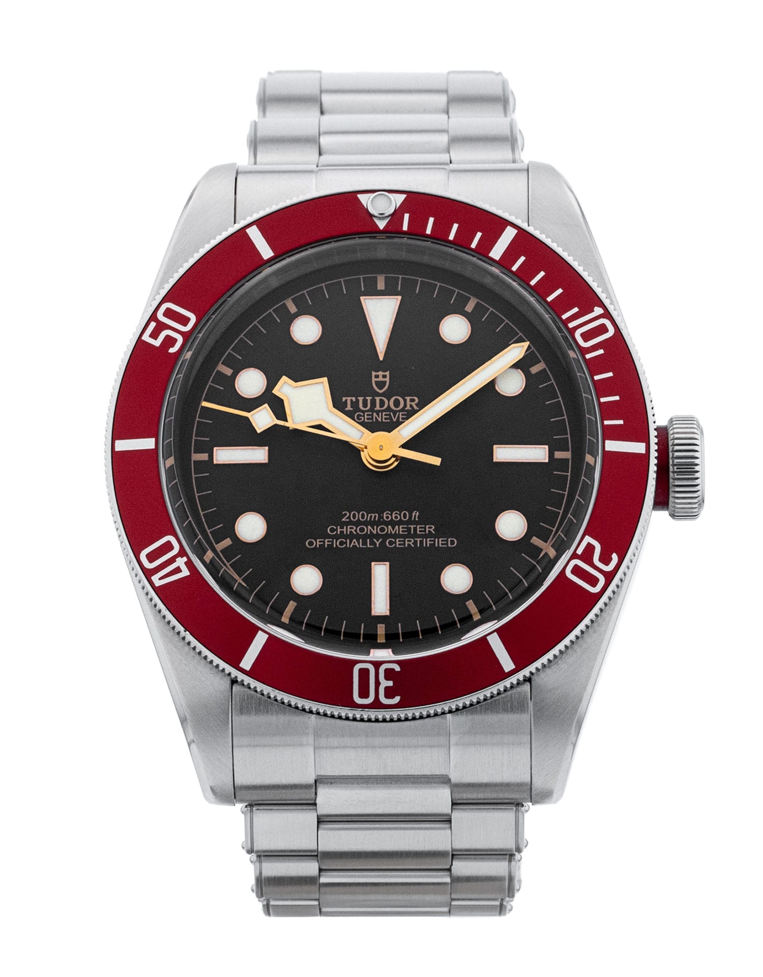 This Tudor Heritage Black Bay 79230R-0003 has a black baton dial and a bracelet strap. This Tudor has undergone a thorough inspection of water resistance, accuracy, functionality and condition to determine the level of reconditioning required to meet our strict standards. It has also been referenced against technical documents and manufacturer records where available to ensure authenticity and a clean history. All our watches have a 24-month warranty for your peace of mind. One of our skilled polishing technicians has removed marks on the case and bracelet of this watch, brought about by daily wear and tear, which is why this watch does not come with the remaining manufacturer’s warranty.