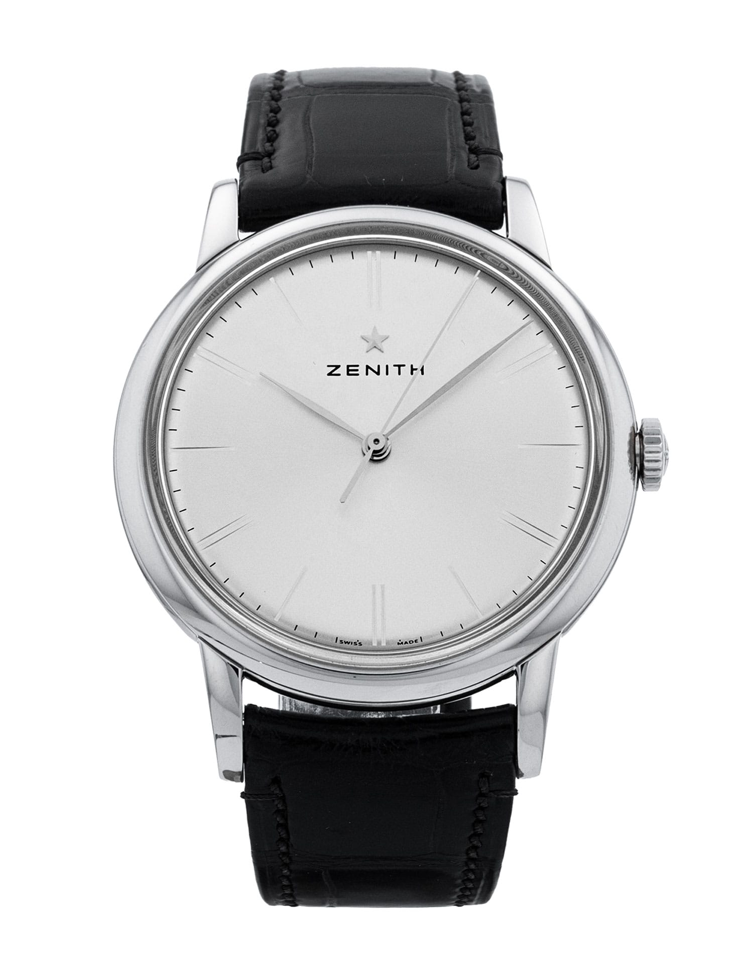 This Zenith Elite 03.2290.679/01.C493 has a silver baton dial and a leather strap. This Zenith has undergone a thorough inspection of accuracy, functionality and condition to determine the level of reconditioning required to meet our strict standards. It has also been referenced against technical documents and manufacturer records where available to ensure authenticity and a clean history. All our watches have a 24-month warranty for your peace of mind.